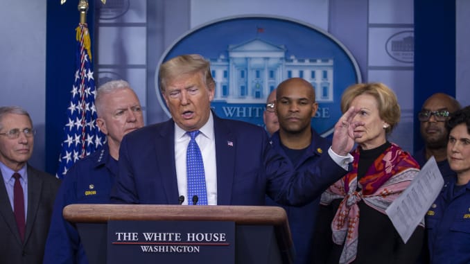Trump is talking BS and dumbing down the virus whilst his advisers shake their heads behind him.