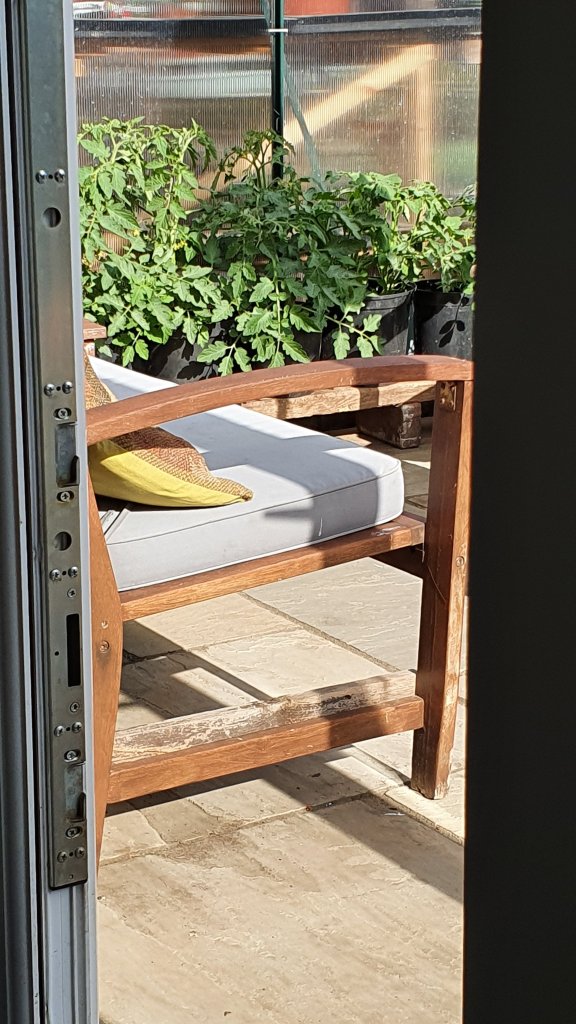 5.25pm. Just been outside to patch up the patio seat. It’s now more metal than wood with the number of screws that I’ve put into it. A buzzard glided overhead to the soundtrack of a Strauss waltz coming from a radio in the next-door neighbour’s back garden. I’m enjoying a beer and some pork scratchings that the family brought back and finishing off my book, ‘The Salt Path’. The warm smell of the tomato plants on the patio are wafting in on the breeze. Bliss..
