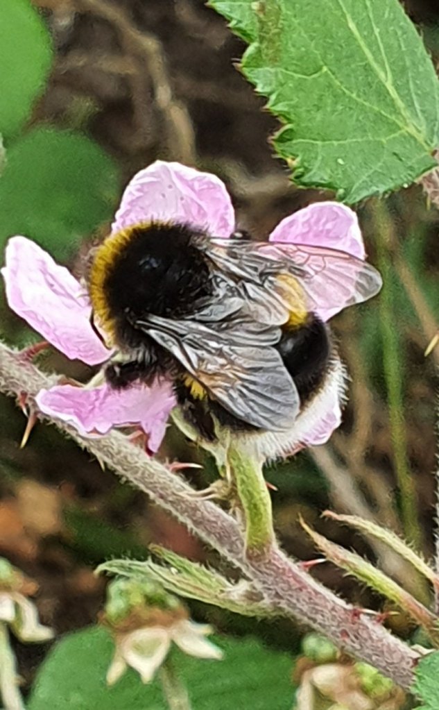 The hedgerow was buzzing with Buff-tailed bumblebees (Bombus terrestris) on the brambles today.