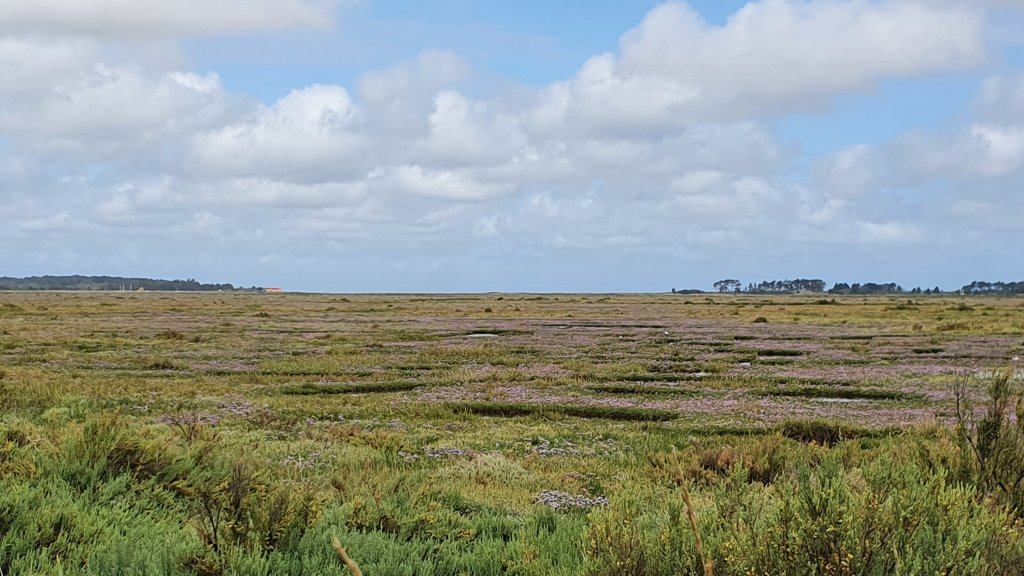 A brief walk through Wells, and we were on the raised footpath heading east. The drizzle had drifted off and the thick cloud had burnt away. Once again, we had a day of huge blue skies and astoundingly vast stretches of salt marsh as far as the eye could strain. Facing north, it was just sky and salt marsh with the occasional thread of golden sand between.