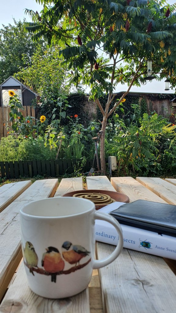 The morning cloud cover has burnt away and we have blistering bright sunshine again, 31°. Lisa and I are sat outside in the back garden, crispy under foot, drinking a cup of tea and reading. It’s too hot to do much else.