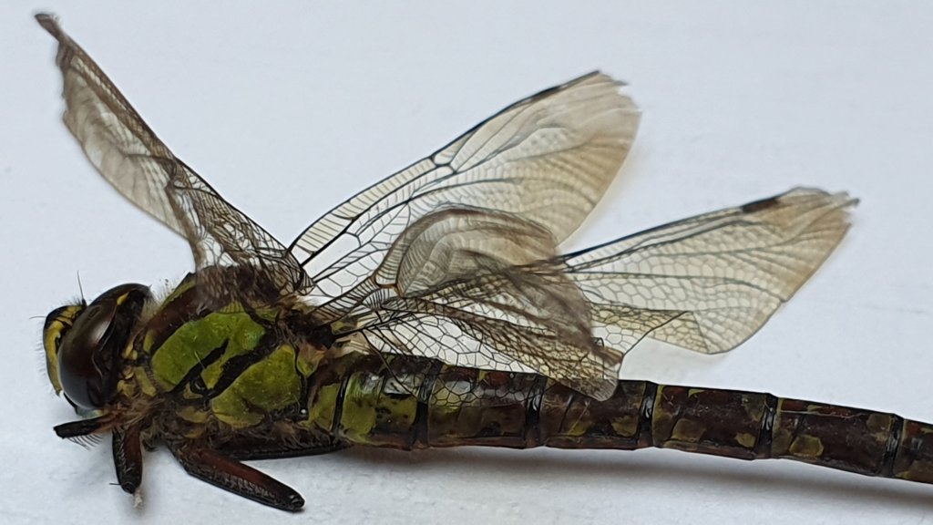 The sun lantern in our family room downstairs is becoming a frustrating trap for insects galore at the moment. The doors and windows are wide open all day due to the hot weather and all manner of winged beasts fly in and try to leave through the glass panes. Sadly, whilst clearing off the insect debris of flies from the ledge that sits under it I found this incredible female Southern Hawker dragonfly.