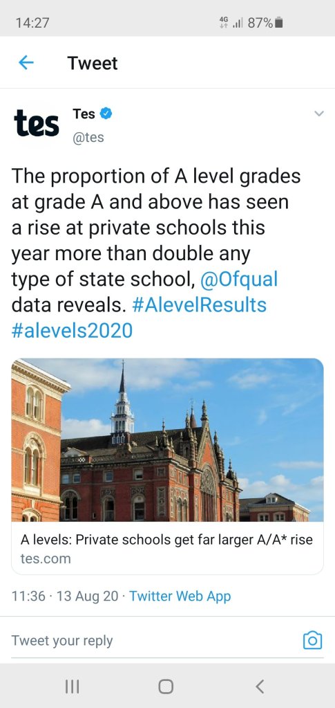 This just underlines the governments approach to a) a sustained lack of promoting social mobility and b) it’s belief in the teachers’ professional knowledge of their students and their subject. It stinks. To add further resentment and anger, the percentage of highest grades has gone up at private schools to the detriment of the state sector. There is no better proof of a tiered system of maintaining a large sub-class of young people (who will become working adults, and eventually become pensioners) who right from the start have a battle on their hands to get ahead. The odds are stacked against them from the start.