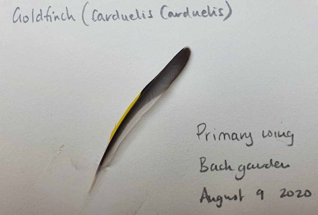 Earlier in the week I found a Goldfinch feather on the lawn. It is small, around 6cm long, and is sheer perfection. It is at the top, alongside the Kestrel feather, as a favourite in my collection. The clean lines and that flash of yellow contrasting with the black and white make it quite striking.