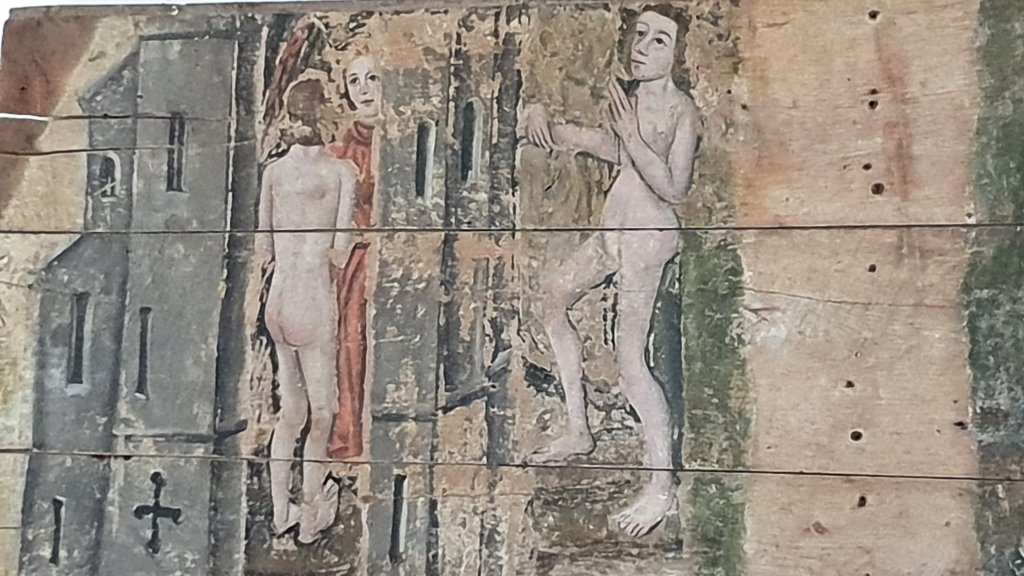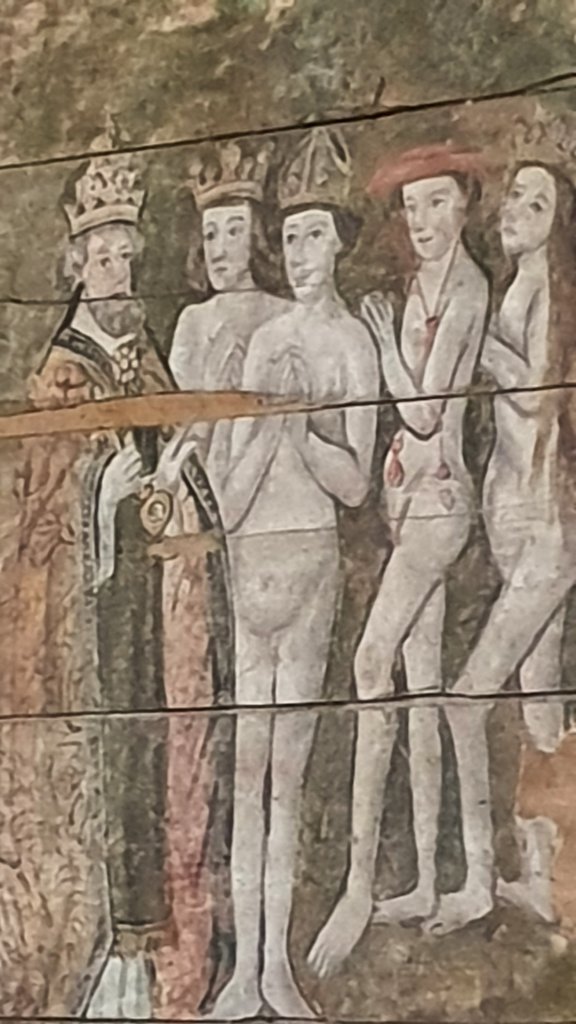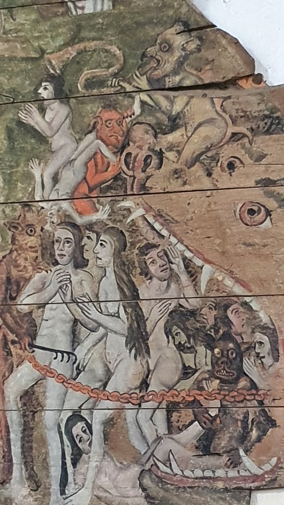 The Wenhaston doom shows naked figures, as judgement strips away all clothing and regalia (except for crowns and cardinals hats naturally). The puritan movement considered this indicative of all that was wrong with catholicism and in the mid 1600s had these images whitewashed or destroyed. The Wenhaston doom was only discovered after the planks of wood we’re piled up outside, only for a heavy downpoor during a thunderstorm to wash away the whitewash, revealing the images beneath. Pure luck?