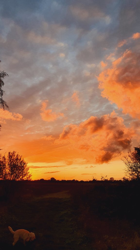 Then we are hit by the rampant autumn sky. We are struck by a sense of fortune, the luckiest people right there, right now. The sky presents itself, clouds, colours and sunshine, putting on a light show just for us. Only we can see what we see. From any other place it would look slightly, or ever so, different. I look behind us and it’s equally as amazing. I get my breath back, walk a hundred steps and look back again, and it has changed.
