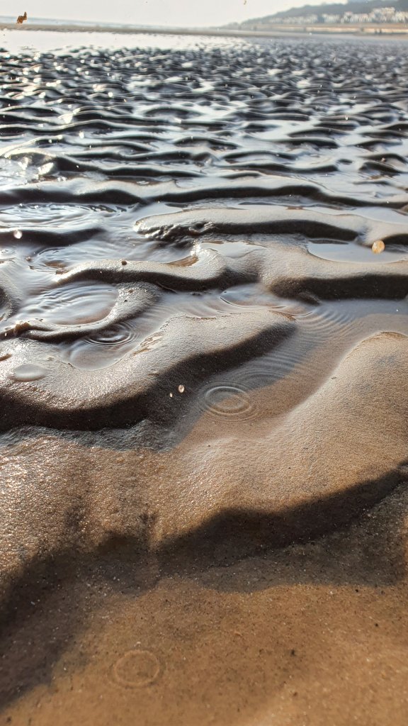 Sand ripples form on the beach as the tide goes out. Grains of sand build up next to each other as the water moves from right to left. I love the idea of one grain of sand starting each ripple. It takes one particle to stand firm, for another to join it. And so on, and on.