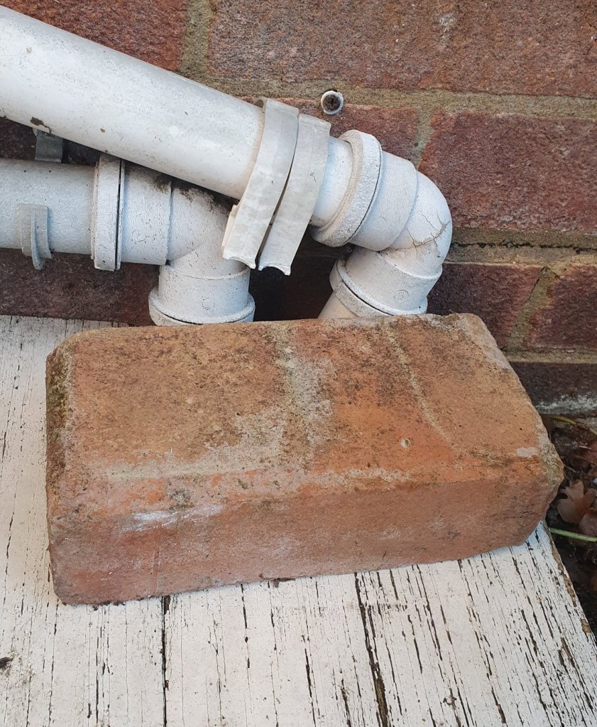 I took a bird feeder over to Dad. It will be great to attract some different species to his garden. It’s currently just pigeons that come in to drink from the water dish. And whilst I was round there I saw a brick propping up a waste water pipe out side. Brilliant.