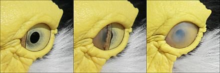 Birds have the largest eyes, relative to their size, in the animal kingdom. They do have two eyelids that operate similarly to other vertebrates but they do not use them for protection or cleaning like we do. These are simply for sleep. They do however, have a transluscent nictating membrane that sweeps horizontally, like a windscreen wiper, and an oily secretion that prevents the eye from drying out in sun or wind. So, now I know.