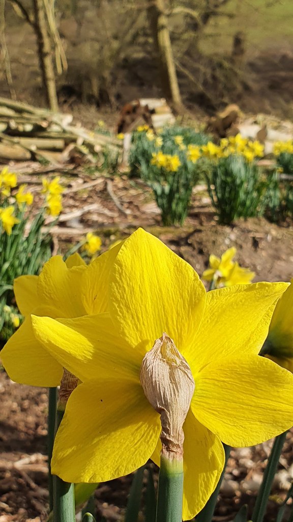 As has become customary for a Monday post, I have saved a few prize thoughts and images from my weekend walks. As we pass through the woods, daffodils nod gently on the breeze that bobs and weeves through the trees over their shoulders. I’d like to think that they’re looking at the smartly stacked logs that have been considerately chopped to size and pyramided together. A thoughtful bit of woodland husbandry that has, in its wake, left a clearing that is being replanted with fresh saplings. I am so grateful of our national network of footpaths but equally appreciative of the landowners who allow public access through their land.